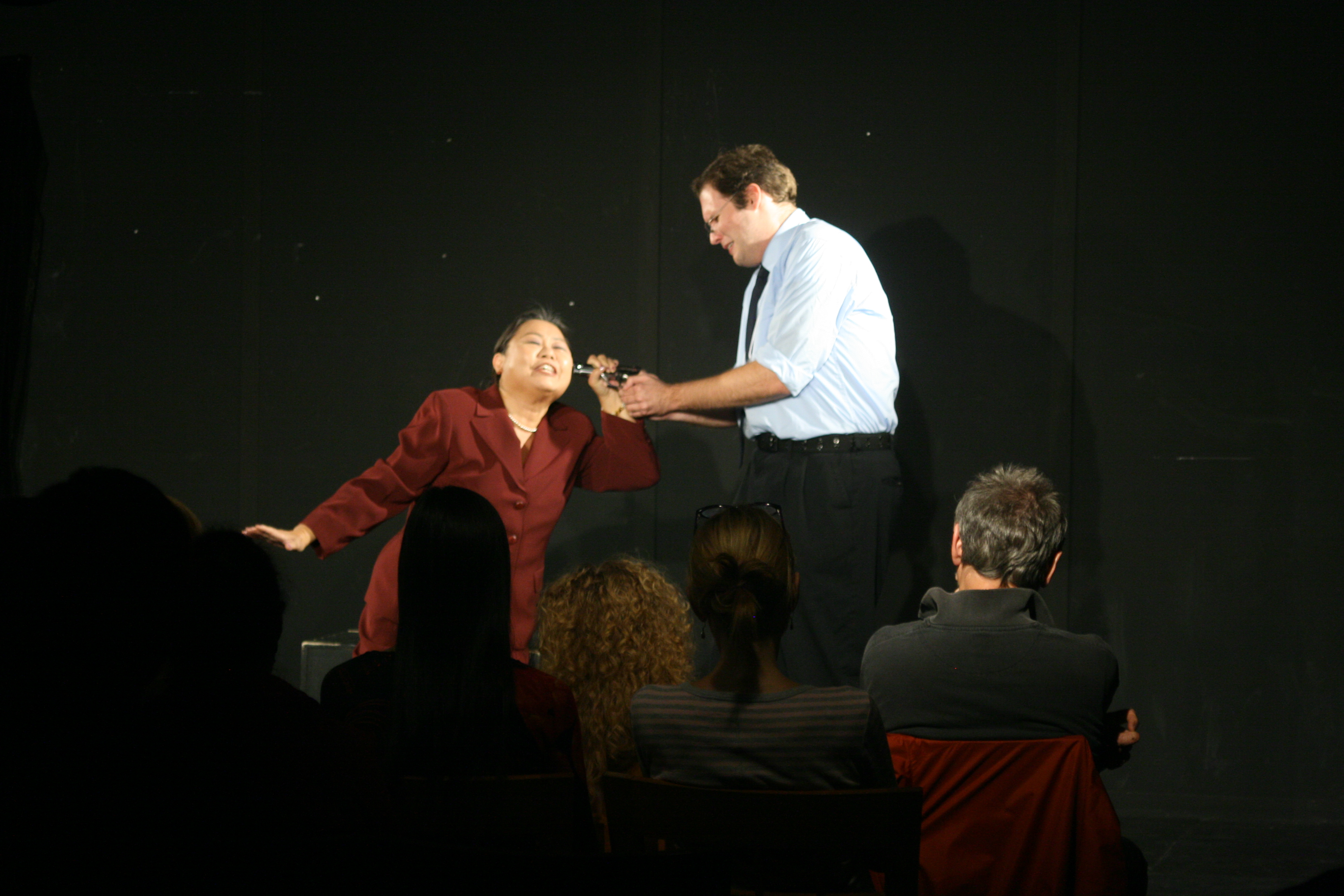 Paths: No Rhymes, No Reasons was a close second. in this sanguine one-man show, Aaron Phillip Watkins portrays a Baltimore native who overcomes an impoverished background to attend a prestigious Business school. Despite his moral fiber and burning desire to make something of himself, he ends up in jail anyway by way of corporate greed. A poignant, well crafted work, Watkins is deeply in element playing various other characters (most notably his side-splittingly hilarious weed-loving best friend) as well as rapping in intelligent, affecting verse. In the end, we all wish his character would have pursued his artistic career rather than fallen prey to the trappings of corporate America. Such a play is right at home at short play lab, with multitudes of actors, writers, and directors in a similar predicament.