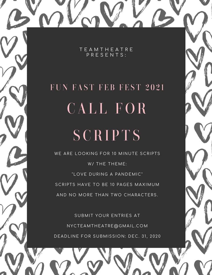 Accepted scripts will be produced by TeamTheatre and will have a premiere on February 14, Valentine’s Day.