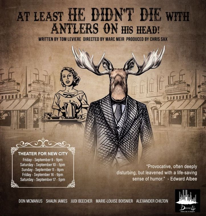 Chris Sax is is the producer and director of the compelling new work, At Least He Didn’t Die With Antlers On His Head. Instead of dipping his toe in the waterfall where he grew up, he dipped it into the well of the arts. After a turn in the music industry, he returned to where his passion was strongest, theatre. “Well let me grab my paint brush, easel and mirror! I grew up just outside of Niagara falls, New York in a small town (Wilson, NY). I started acting in my drama class and got cast as a leads in a couple high school musicals and soon I had the bug. I always like a good story. I learned how to play guitar and sing so when I was 18 I moved to Nashville, Tenn like every Taylor Swift wanna be. After working in the music industry I returned to my first love theater. I went to a drama program and studied at Rose Bruford College in Kent and the rest is history.”