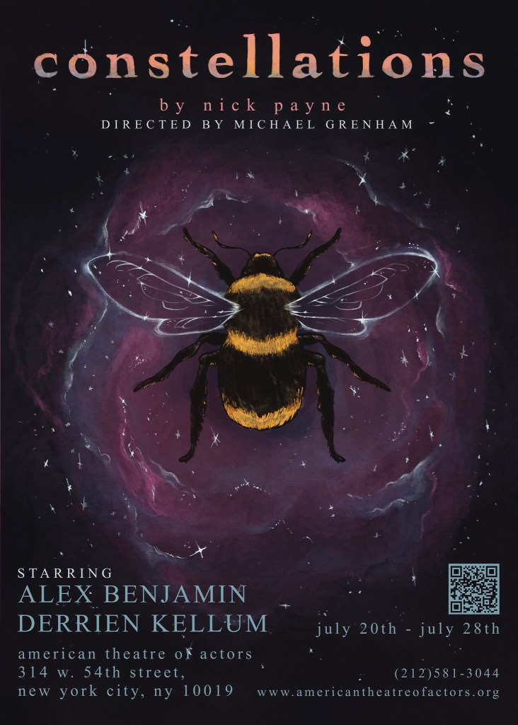 After seeing Nick Payne’s Constellations at the American Theater of Actors, I have nothing but the deepest respect for the actors and directors who decide to tackle this interesting, tricky, and often poignant script. Working in the theory of a multiverse wherein every choice we make or don’t make all exist simultaneously in different parallel universes with different parallel versions of ourselves, the play presents a series of snapshots in the lives of two people as their relationship plays out in different ways across these different universes. Some are very similar, others vastly different. Some of these scenes are short, some longer, some sad, some joyful, a couple of brief moments terrifying, but it all amounts to an incredible challenge for the performers and a powerful journey for the audience.
