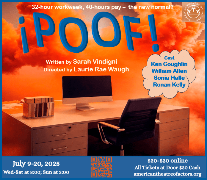 ¡Poof! a play by Sarah Vindigni, Directed by Laurie Rae Waugh featuring Ken Coughlin, William Allen, Sonia Halle, and Ronan Kelly.